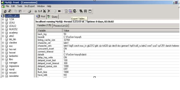 Mysql Front is a client for Windows that allows for the management to manage a local or remote DB through a client interface. Since we consider PHP-Nuke to be more aproppriate and flexible tool for this task, we would like to focus our attention a little on a functionality of MySQLFront that on PHPMyAdmin has shown itself to be little reliable. That is the ability to load, import and export DBs of great dimensions without losing data or getting errors.