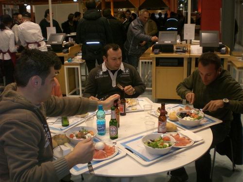 Traffico scorrevole sino alla barriera di Melegnano poi autostrada intasata. Tutti fermi,34 km di colonna all'uscita della fiera! Al Lomba gli prende uno sbocco di arterio e quindi esce dall'autostrada tentando di raggiungere il polo fieristico da via normale. Pasticciando con ben due navigatori che davano ovviamente indicazioni diverse ad ogni incrocio e dopo aver passato in sequenza tutti i paesi dell interland Milanese riusciamo ad arrivare in fiera alle 18.30. Non male ...