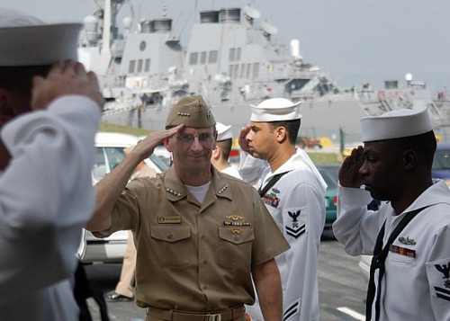 Vediamo il neo Contrammiraglio passare in rassegna l'equipaggio prima di salpare con la nave con cui ha effettuato l'esame. Per l'occasione una bella portaerei