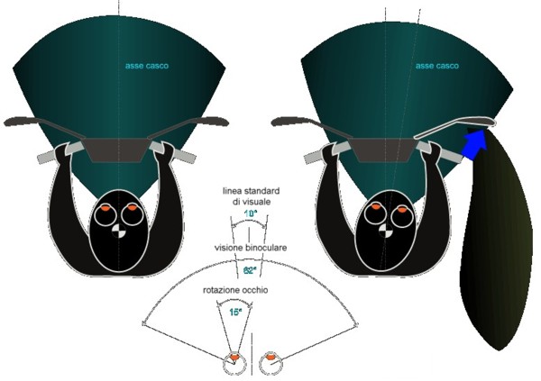 Per salvaguardare la nostra integrità in moto, indipendentemente dalle nostre virtù motociclistiche, occorre allenarsi costantemente alla pratica d’utilizzo degli specchi anche se, all’inizio, può sembrare faticoso e complesso. Tengo a sottolineare che l’operazione di lettura delle informazioni provenienti dagli specchi deve essere effettuata con un vero e proprio automatismo dalla rapidità impressionante: non ci si deve certo fermare ad ammirare il… panorama alle nostre spalle! Alleniamo, invece, la capacità offerta dall’ampiezza del campo visivo del nostro occhio. Possiamo fare questo ruotando leggermente la testa verso lo specchio che vogliamo inquadrare mantenendo, però, lo sguardo sempre rivolto in avanti: così facendo vi accorgerete che l’occhio più vicino al retrovisore è come se aumentasse leggermente la sua ampiezza di campo visivo consentendovi di inquadrare (con la sua cosiddetta… coda) lo specchio: magari la visione non sarà molto nitida ma giusto sufficiente per l’uso di monitoraggio: