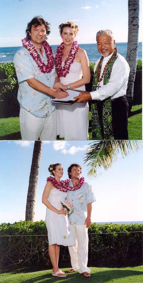 il prete, detto più educatamente MINISTER, è HAWAIANO...ci ha sposato in inglese e in lingua locale...MAHALO MAUNAA AKANAKA...e via che ndom...ROBADAMAT...