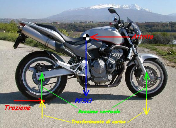 In accelerata viene impressa una forza motrice alla ruota posteriore, mentre al baricentro del sistema si applica una forza resistente, ovvero un inerzia dell'insieme moto-pilota. Al contempo si ha una variazione dei carichi verticali agenti sulle ruote, ovvero un trasferimento di carico.