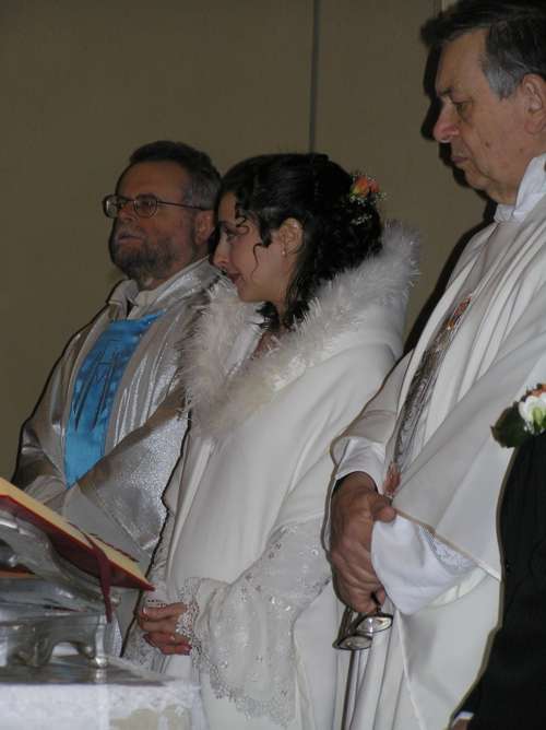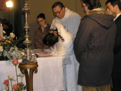 Foto in suggestiva penombra degli sposi all'interno della chiesetta