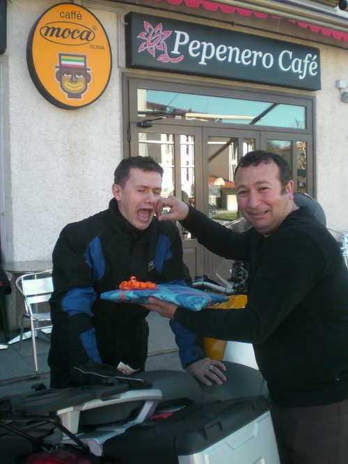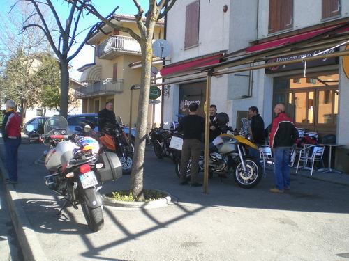 Classico ritrovo davanti alla birreria rinnovata. Pepe nero cafè, per una volta tutti abbastanza in orario. Partecipanti.