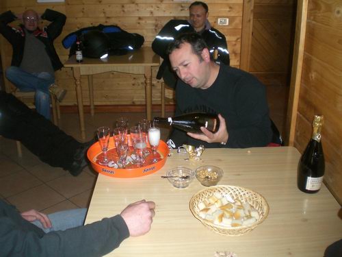 Sosta con boccia di Prosecco e focaccia ligure. Guardate Paolo con che maestria mesce il vino