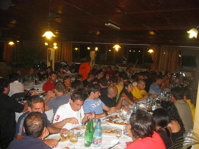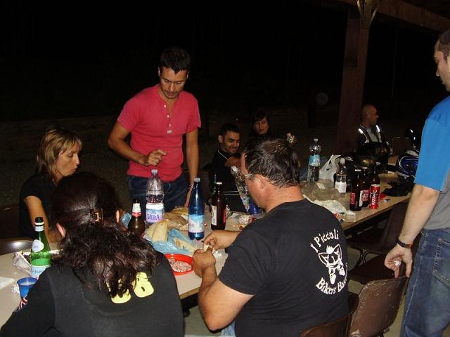 Grazie a bevande e cibarie portate da ognuno dei partecipanti, due tavoli pieni di pane, salumi, pizza, formaggi, vino e birra, dolci per una splendida cena in compagnia, finita per i saluti al Bar di Pietramala per un meritato caffè.