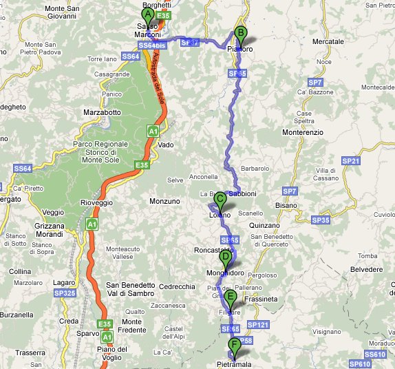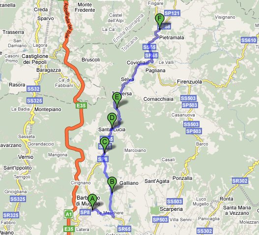 Un classico il percorso anche per i Toscani, da Barberino del Mugello al passo della Futa e poi Passo della Raticosa sulla mitica SS65 della Futa, per incontrare il gruppo Emilia e Romagna e dar vita ad un unico grande gemellaggio notturno. Gli Emiliani che arrivano da Monghidoro, i Romagnoli da Monterenzio, e i Toscani dal passo della Futa, per illuminare a giorno il passo della Raticosa
