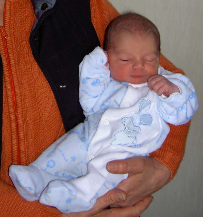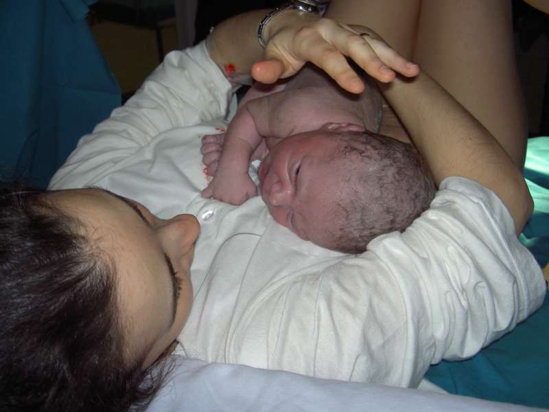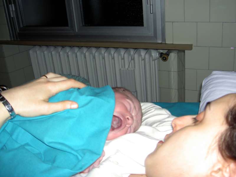 Eccolo a un paio di minuti dalla nascita, quando le ostetriche lo hanno appoggiato alla pancia della mamma, che la guarda abbastanza scettico, come dire: "mannaggia, sei stata tu a tirarmi fuori di lì che ci stavo così bene?"