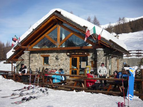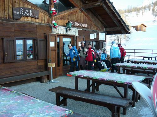 Prendiamo la funivia ed arriviamo sulla cima Fraiteve a 2700 mt. Oggi scieremo sul versante di San Sicario