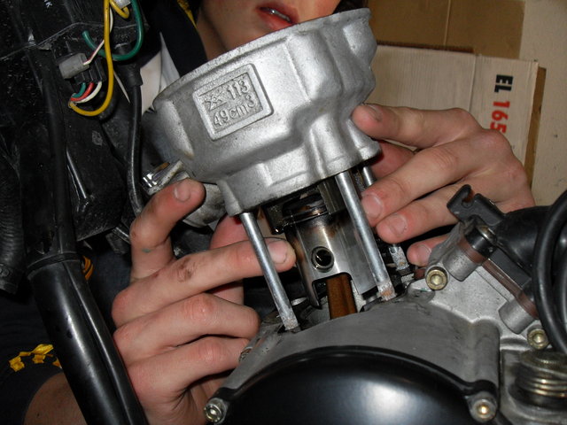 Fortunatamente le cose sono andate meglio di quanto pensassimo, benché non eccellentemente: i travasi e lo scarico rimanevano leggermente coperti dal pistone! Questa proprio non ci voleva... Questa cosa ci ha quasi mandato nel panico, perché avrebbe potuto succedere di tutto.... Abbiamo valutato se sfilare il nuovo gt da 73cc e mettere guarnizioni più spesse alla base di questo.... Ma abbiamo constatato che il gioco non valeva la candela... Perciò abbiamo sistemato le guarnizioni della testata, che ci hanno fatto perdere non poco tempo: una guarnizione circolare, posta intorno alla camera di scoppio, non voleva saperne di stare nella sua sede, ma abbiamo risolto usando il phon da carrozziere, facendo dilatare la gomma di cui era fatta la guarnizione.