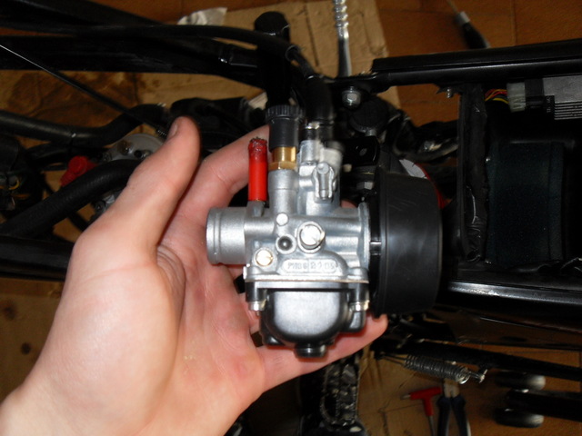 Un altro momento di "alta tensione" è stato quando dovevamo richiudere il carburatore... La molla che spinge la ghigliottina era davvero dura e lunga; abbiamo dovuto usare due fascette per tenerla ferma, per poi infilare il cavo dell'acceleratore nella sede apposita sulla cima della ghigliottina. Tutto però si è risolto, ed abbiamo serrato tutte le viti.