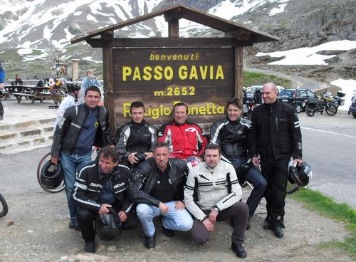 Salita al primo passo GAVIA ( mt.2651 ) Vediamo il Fox con il nuovo BMW ed una bella foto di gruppo. Piccola merenda ( salumi-formaggi e birra...) e poi ripartiamo