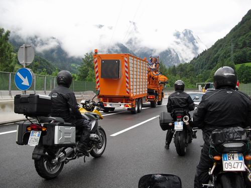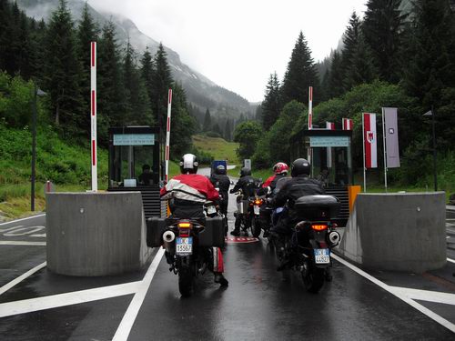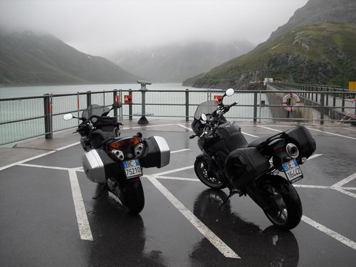 Partenza la mattino sotto la pioggia per la gioia del presidente che monta un treno di gomme slick. Il Biondo ci abbandona per tornare a casa ove Laura ha avuto un piccolo problema di salute ora risolto. Svalichiamo l' ALBERGPASS ( 1793 mt ) poi proseguiamo verso la successiva tappa il SILVRETTA HOCHALPENSTRASS ( 2032 mt ). Una sosta sul piccolo tratto di autostrada ci permette di ammirare il nuovo KIt di sopavvivenza di BC. Le calosce modello palombaro...
