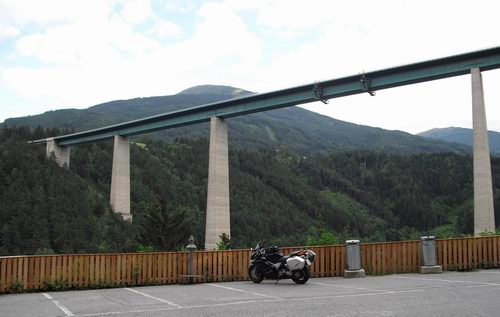 Io e Fox tiriamo dritti e ci ritroviamo con gli altri a San Leonardo in Val Passiria da dove partiamo tutti assieme per il PASSO DEL MONTE GIOVO ( 2099 mt. ) Proseguiamo verso la vecchia statale del BRENNERO ( 1375 mt. ) e torniamo in Austria direzione Innsbruck ove passeremo la notte. Bello il ponte Europa visto da sotto.