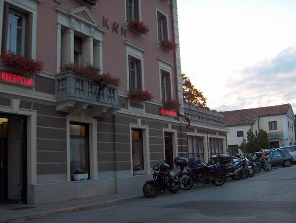 Dopo una bella strada che costeggia un fiume arriviamo a Tolmin. Nella foto le moto parcheggiate davanti all'Hotel.Nel tragitto alcuni di noi hanno avuto anche il tempo di litigare con un conducente di PicK UP che probabilmente aveva bevuto troppa "Pivo" ( birra ) Purtroppo non sono riuscito a documentare ed anche le notizie ricevute in seguito sono state alquanto lacunose...