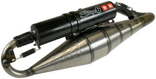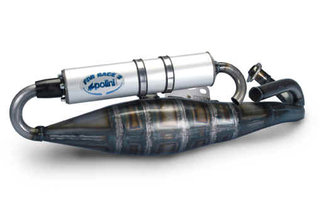 R – marmitta da 50cc e 70cc base poco spinti, omologata, prestazioni ottime su 50cc, simile alla Stage 6 Pro Replica, disponibile con silenziatore grigio (170 euro), in kevlar (190) o black edition (190), taratura comune: molla bianca (minarelli) o molla originale (piaggio), mollette gialle malossi e rulli sui 4.5 grammi. Ottime le prestazioni, con una buona taratura e una buona carburazione aumenta sensibilmente velocità massima e ripresa.