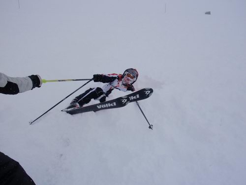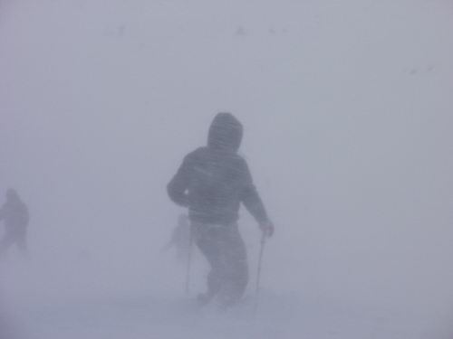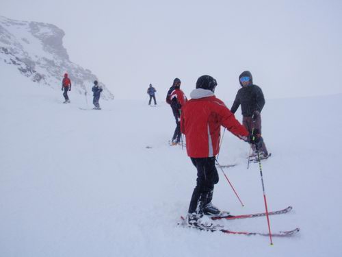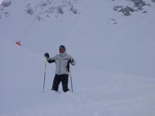 Ci svegliamo la mattina sotto una tormenta. Non domi facciamo lo skipass e tramite la funivia ci portiamo a 3100 mt del Glacier de Peclet. Bufera di neve e temperatura sotto i -15. Qui scopriamo con entusiasmo che i nostri amati cugini Francesi hanno la bella abitudine di non battere ( o poco ) le piste quando nevica quindi scendiamo in mezzo a buche e neve fresca con visibilità quasi nulla. Qui qualcuno dei nostri saggia il terreno
