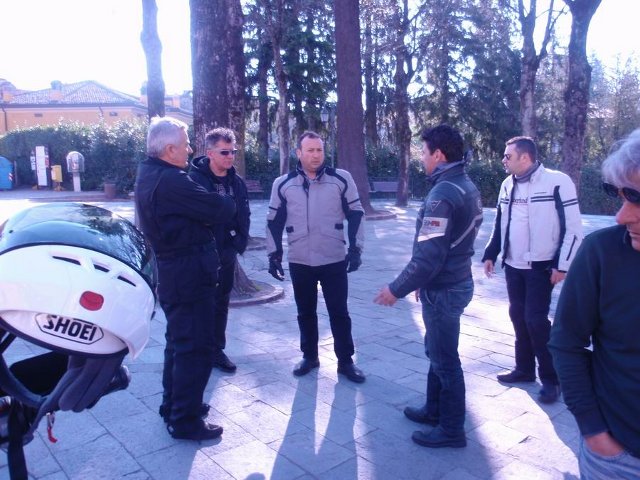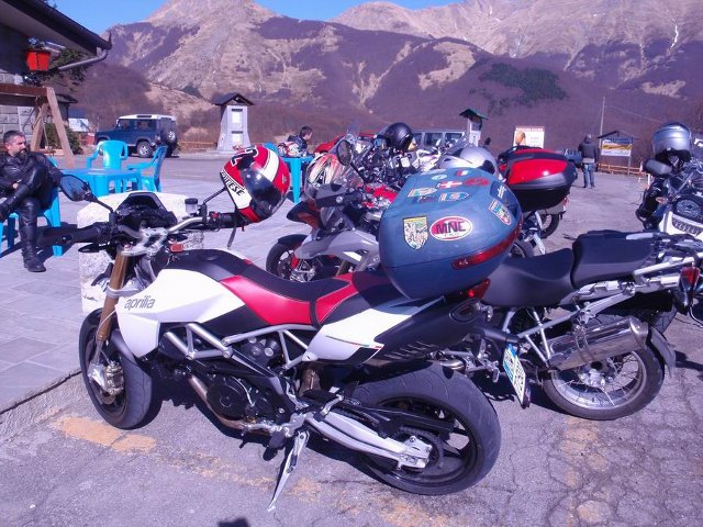Arrivo al Cerreto. Notare la "lombardata" sulla Dorsoduro. Il mitico bauletto " nonfango " che accompagna tutte le moto di Lomba dal 1995. L'ufficio legale della casa veneta sta comunque pensando di adire alle vie legali...