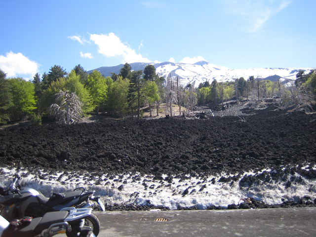 E’ l’ora di prepararci per attaccare la strada che sale sull’Etna. Perpetro l’obiettivo che mi ero posto ad inizio giornata e mi metto in sella alla Multi. Mappa “sport”, occhio alle linee delle nostre guide e… gaas!! Devo ammettere che la guida si fa davvero piacevole ed emozionante, la Ducati danza fra le curve in modo perfetto e nonostante non possa dire di conoscere la moto e le gomme, mi trovo ad uscire dalle curve con corpose “manate” di gas. La fiducia è tanta, la guida fluida ed il divertimento elevato! Arriviamo in quota e quando la vegetazione si dirada, lo spettacolo del vulcano attivo più alto d’Europa si erge sempre spettacolare ed emozionante.