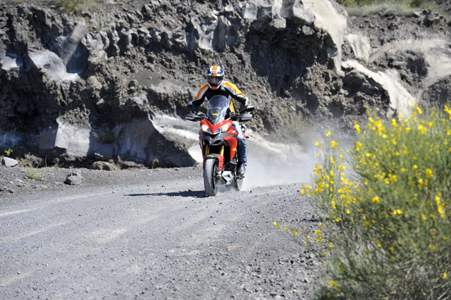 Indomani, appunto. Ricca colazione, preparazione, istruzioni e via che si sale in moto. Oggi so di per certo che prima o dopo ci sarà un tratto di salita per le strade dell’Etna e mi pongo l’obiettivo di poterlo fare con la moto giusta. Quindi lascio l’albergo in sella alla Multistrada, giusto per marcare il territorio… :)) Percorriamo un tratto di fluida strada litoranea, quando le nostre guide deviano su una strada secondaria che porta a quella che sembra una ex-cava, fermandosi all’attacco di una carrabile completamente sterrata: è infatti il momento di saggiare le doti delle S-T su un percorso sterrato. Come detto si tratta di una strada carrabile usata da fuoristrada locali per le escursioni sul vulcano, quindi nulla di particolarmente impegnativo in termini di spazi ed irregolarità del fondo, ma dove in ogni caso servono doti di trazione e stabilità per potersi muovere senza particolari rischi. La mia esperienza fuoristradistica è decisamente ridotta, per cui affronto i passaggi con circospezione ed umiltà.