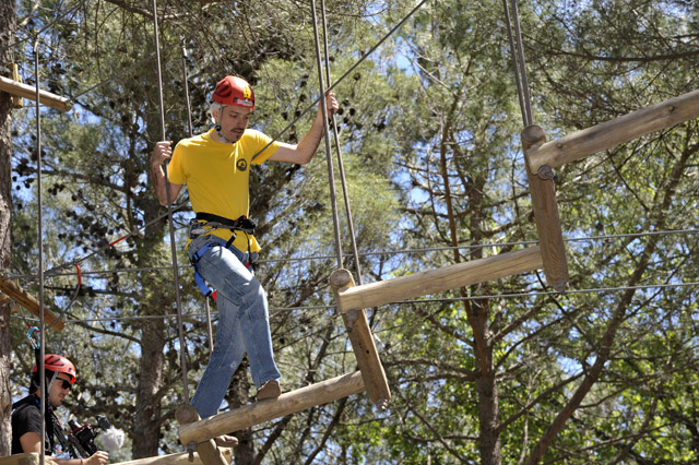 Ci rimettiamo in sella e dopo aver riconquistato la strada asfaltata, le nostre guide ci dirigono verso il teatro delle prossime due sfide “tester VS smanettoni”. Giungiamo quindi al Parco Avventura Etna, dove i simpatici gestori ci accolgono e ci istruiscono su come affrontare i percorsi definiti da Luca e Chiara per sondare altre due caratteristiche delle S-T, ovvero la stabilità ed il grip. Ci ritroviamo quindi imbragati di tutto punto ed esortati a salire la scaletta a pioli da dove ha inizio il percorso sospeso fra gli alberi della pineta. Gli ingredienti ci sono tutti: ponte tibetano, pioli sospesi, passaggi su pedane più o meno semoventi. La stabilità è effettivamente una dote da perseguire se non si vuole finire appesi per i cavi di sicurezza!