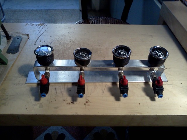 A questo punto si procederà ad alloggiare tutte le componenti nel supporto appena creato: per prima cosa bisogna avvolgere tutti i filetti maschio con il film di teflon, poi inserire i vacuometri nei fori, ed avvitare i raccordi a 90° dal lato femmina nei raccordi dei vacuometri che sporgono, successivamente avvitare le valvole a sfera sui raccordi a 90° e i portagomma sulle valvole. Ad assemblaggio ultimato inserire dei tubi di gomma di diametro appropriato sui portagomma, se necessario stringere con delle fascette, è importante la tenuta perfetta. Il risultato finale dovrebbe somigliare un po' a questo: