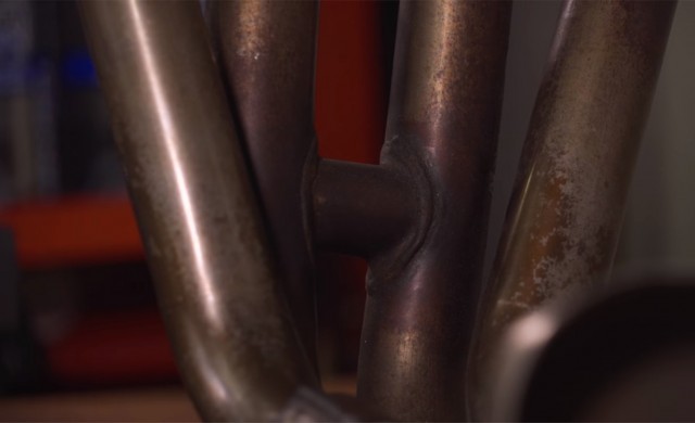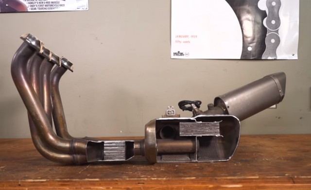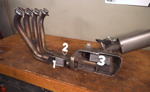 Scendendo più in basso, i quattro tubi delle testate si uniscono secondo varie configurazioni (nel nostro caso lo scarico è un 4-1-1), e si incanalano dentro al collettore; quest'ampia cassa di risonanza è il vero e proprio silenziatore della moto, il quale ospita al suo interno anche i convertitori catalitici.