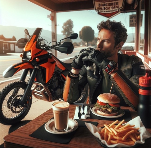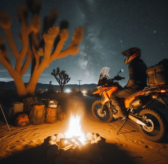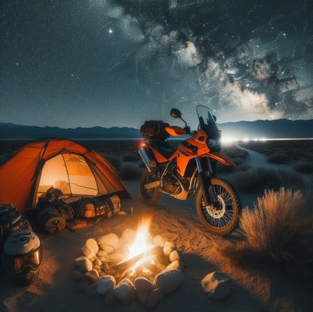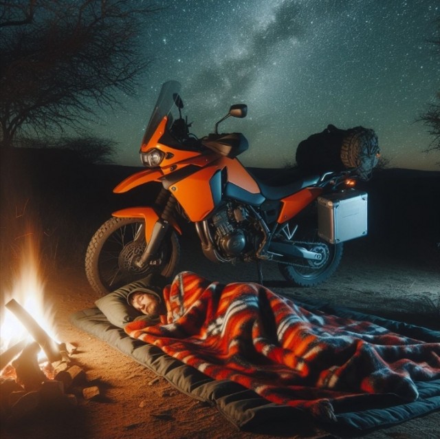 Le Sere al Campo: Quando il sole tramonta, Enrico parcheggia la KLR vicino a un fuoco scoppiettante. La moto sembra riposare, il suo metallo caldo al tatto. Enrico si sdraia accanto a lei, guardando le stelle sopra di loro. La KLR sembra ascoltare, come se avesse una storia da raccontare.