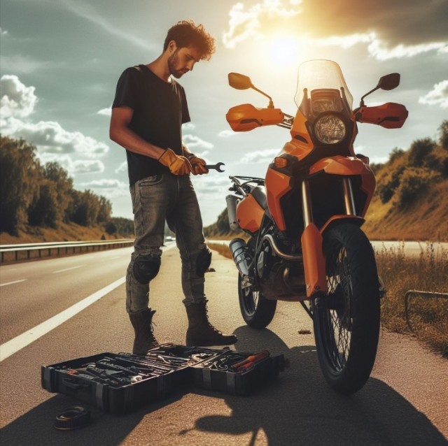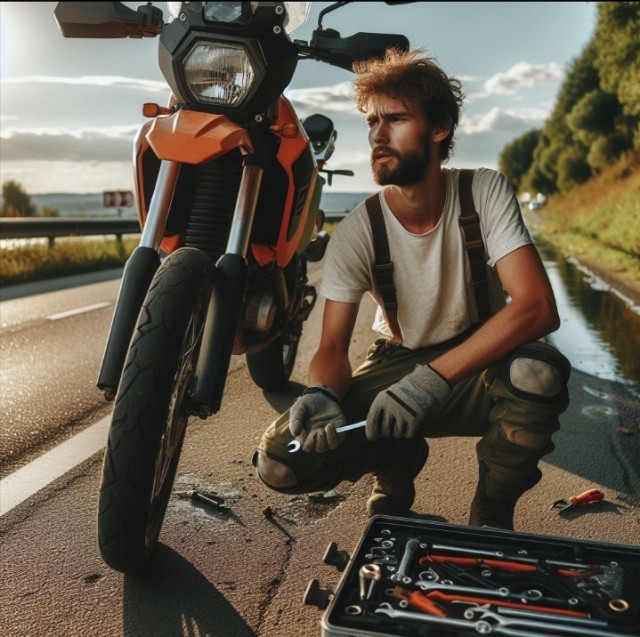 Le Riparazioni Improvvisate: La KLR 650 ha bisogno di cure costanti. Enrico stringe una chiave inglese arrugginita, donatagli da un vecchio meccanico nel Texas. Si china sul motore, sudando sotto il sole implacabile, e la KLR sembra ringraziarlo con un rombo appena percettibile.