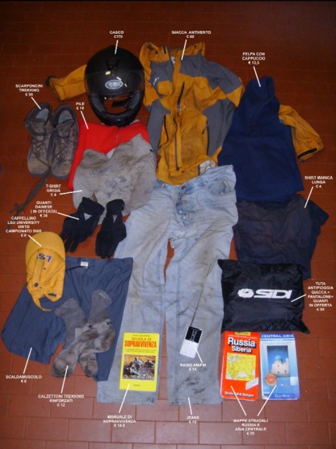 R- Seguendo la regola del 2: due magliette, due paia di calze, due paia di scarpe ( scarponcini da montagna per guidare e scarpe da ginnastica per le soste) due paia di pantaloni. Poi considero anche quello che indosso. Secondo il clima posso prendere piumino, giacca antipioggia, guanti più o meno pesanti, il casco (preferisco il mio). Forse la tenda ( 1 kg) e il sacco a pelo. Però non si tratta di abbigliamento tecnico: jeans e il resto siamo in linea coi vestiari della Decathlon.