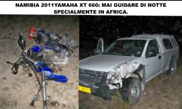 R- Beh sicuramente in Namibia con uno Yamaha 660XT noleggiato a Città del Capo in Sud Africa. Ero andato a fare un safari di mezza giornata in un parco su una jeep. Distava 80 km dal mio ostello. Sono ripartito nel tardo pomeriggio e mi sono ritrovato nel buio assoluto. Una jeep di una coppia svizzera guidava a destra (contromano quindi in Namibia). Mi sono spostato, si sono spostati anche loro e cosi alla fine frontale. Sarebbe stato sufficente spostarsi a lato strada (c’era tutto lo spazio del mondo), ma la stanchezza e il buio mi hanno imbambolato. Moto distrutta, ruota anteriore a 20 metri, pannelli saltati via. Io me la sono cavata con uno strappo al pettorale: posso ancora accendere un cero. Mai guidare di notte, specialmente in Africa