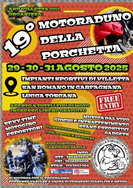 Un Raduno Senza Barriere aperto a tutti i tipi di moto, il Motoraduno della Porchetta accoglie centauri di ogni genere, offrendo ingresso e campeggio liberi.