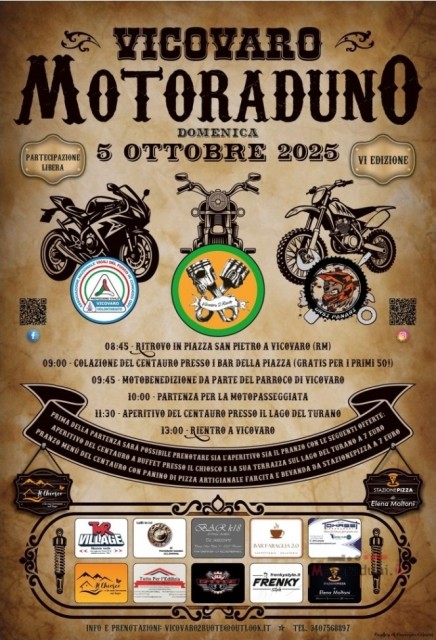 Per ulteriori informazioni, è possibile contattare l'organizzatore al numero 3407568897 o all'indirizzo email VICOVARO2RUOTE@OUTLOOK.IT.