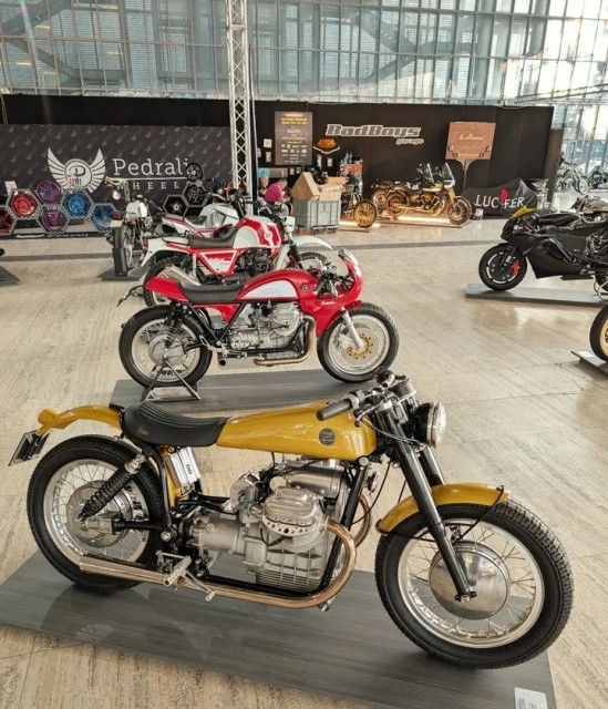 Il fermento era palpabile soprattutto attorno al contest di customizzazione, con preparatori italiani e internazionali che esponevano le loro creazioni più audaci. Non si trattava solo di moto, ma di vere e proprie dichiarazioni di stile. Passando tra le file, ho avuto modo di scambiare due chiacchiere con alcuni artigiani, tra l'altro con Filippo Barbacane (a cui ho dedicato un articolo in passato con una intervista) che era presente con il suo Stand Officine Rossopuro e alcune bellissime realizzazioni su base Moto Guzzi, che con orgoglio mi ha spiegato i dettagli tecnici e stilistici dietro la verniciatura o la lavorazione del metallo delle loro special.