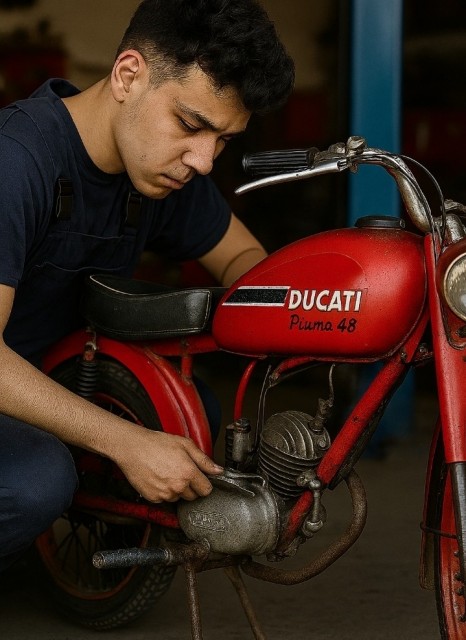 La sua avventura iniziò la sera stessa. Con fatica, spinse la moto fuori dal garage, la lavò per ore con spazzole e sapone, scoprendo poco alla volta la sua bellezza originale. Poi iniziò il lavoro più duro. Smontò pezzo per pezzo la moto, catalogando ogni vite, ogni bullone, ogni rondella. Alcuni pezzi erano inservibili, altri potevano essere recuperati. Passò mesi a cercare ricambi online, in mercatini e da vecchi meccanici di paese. I suoi risparmi si assottigliarono in fretta, ma la passione era più forte di ogni preoccupazione.