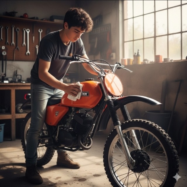 Quel pomeriggio, il sole picchiava implacabile. Maurizio era seduto sul muretto del garage, le ginocchia scorticate, i pantaloncini corti e una maglietta scolorita. Stava lucidando il serbatoio arancione della Six Days con uno straccio unto.