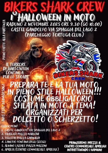 Il Bikers Shark Crew organizza il primo "1° Halloween in Moto", un evento gratuito e aperto a tutti per celebrare la ricorrenza in sella tra le splendide strade dei Castelli Romani.