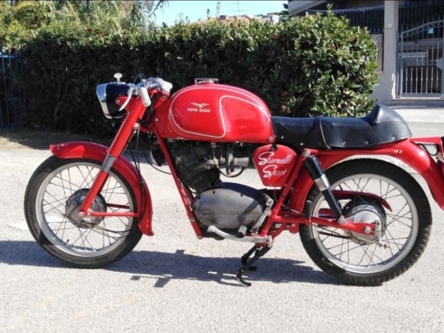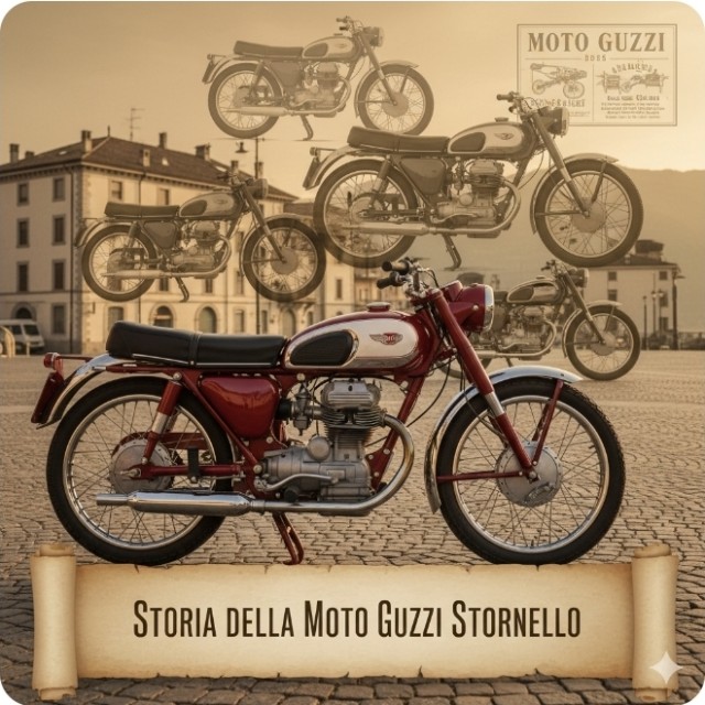 Il progetto dello Stornello è legato al nome dell'Ing. Giulio Cesare Carcano, già responsabile del reparto corse e padre di miti come l'Otto Cilindri e il futuro V7. Presentata alla Fiera di Milano nel dicembre 1959 e in vendita dal 1960, la Stornello si distingueva per essere la prima monocilindrica a quattro tempi della Moto Guzzi a valvole in testa parallele, con un design mirato alla massima economia di costruzione e gestione.