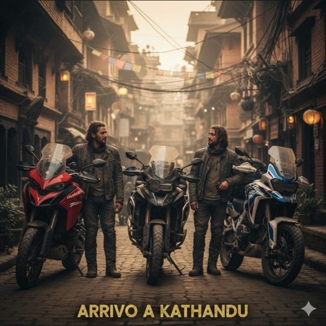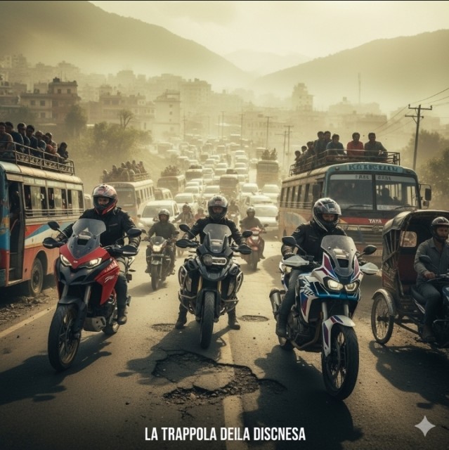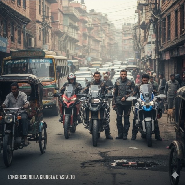 Lasciata Thankot, la strada si trasformò in una discesa vertiginosa e tortuosa, la porta d'ingresso naturale nella vasta e inquinata Valle di Kathmandu. La maestosità del panorama svanì presto, sostituita dalla realtà del traffico urbano in espansione: un fitto muro di veicoli che si muovevano a passo d'uomo, un balletto caotico di clacson, fumi e clacson. Marco, in testa, usò l'agilità della sua Ducati Multistrada V4 rossa per zigzagare tra i veicoli. Il suo stile di guida, aggressivo ma preciso, si fondeva con la necessità di trovare ogni minimo varco disponibile. Luigi dietro, con la sua BMW R 1300 GS nera, sfruttava la sua altezza e la posizione dominante per vedere oltre il caos, guidando la sua moto con la calma di un treno. Gianni, con la sua Honda Africa Twin, si teneva in coda, concentrato a mantenere il gruppo unito.