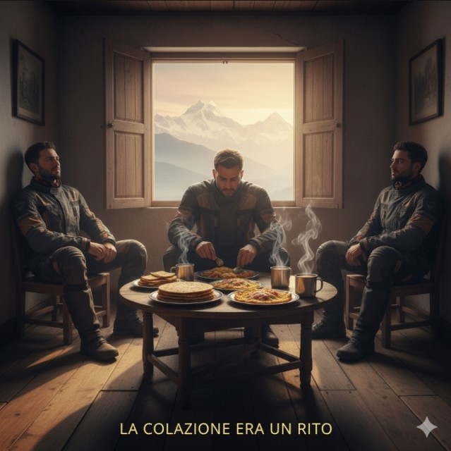 Il primo a muoversi fu Marco. Si infilò la giacca di pelle e si diresse al piano di sotto, dove un aroma di spezie e caffè forte aleggiava nell'aria. Con la meticolosità di chi vive per la strada, aveva già controllato le gomme della sua Ducati Multistrada V4 rossa. Pochi minuti dopo, lo raggiunsero Luigi e Gianni.