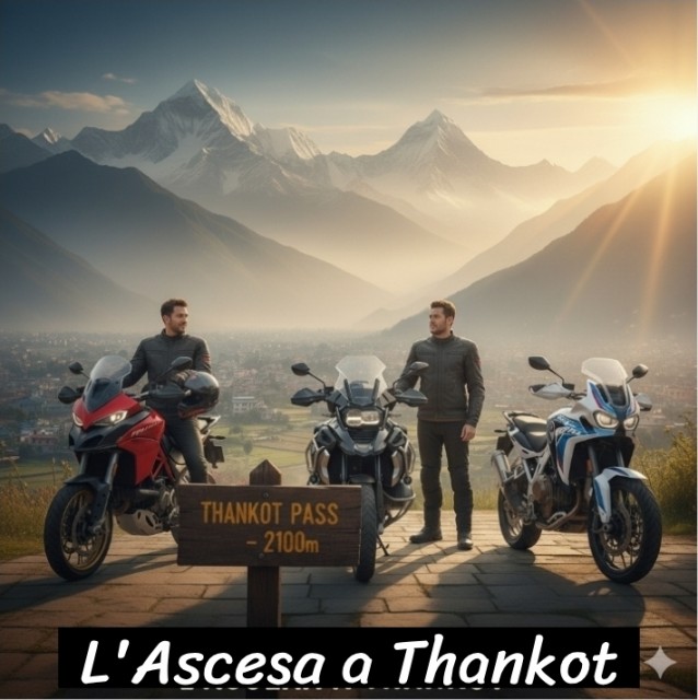 La pausa fu breve, l'orologio segnava mezzogiorno e volevano superare il valico di Thankot prima del picco del traffico pomeridiano. Ripresero la marcia. La strada iniziò a salire dolcemente, poi con curve sempre più strette e continue. Questo era il terreno di gioco preferito di Marco. La Ducati rispose con prontezza, il telaio leggero e il motore potente che la spingevano fuori dalle curve con un'accelerazione esaltante. Marco giocava con il cambio, le ginocchia quasi a terra. Luigi non era da meno. La sua BMW rivelava la sua incredibile versatilità, stabile in frenata e potente in ripresa, macinando i tornanti con una sicurezza imponente. Gianni, con la sua Honda, manteneva il ritmo, apprezzando l'erogazione fluida e prevedibile del bicilindrico, perfetta per le salite ripide dove la trazione era tutto. Intorno alle 14:00, raggiunsero l'apice della salita: Thankot. La vista da lassù era maestosa. Sotto di loro, la valle di Kathmandu si apriva, un'immensa distesa di case, campi e templi che si perdevano all'orizzonte. L'aria era più fresca, il cielo più blu, anche se una nube di smog aleggiava sulla metropoli in lontananza.