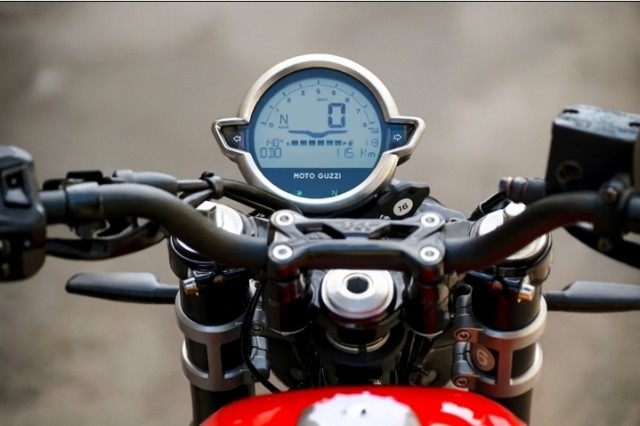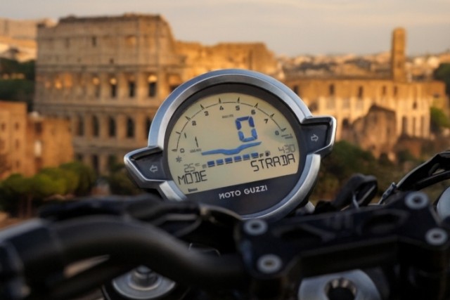 La strumentazione è completamente digitale, con un display LCD rotondo che fornisce tutte le informazioni essenziali, inclusi gli indicatori dei riding mode e il livello di carburante (un'aggiunta pratica). L'illuminazione è Full LED su tutta la moto, con il DRL anteriore che disegna la stilizzata sagoma dell'Aquila di Mandello.