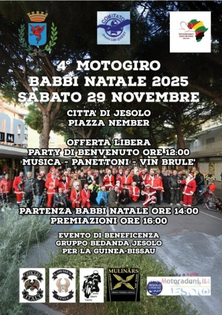• Ore 14:00 – PARTENZA del Motogiro: Il momento clou. Tutti i Babbi Natale in moto partiranno per il Motogiro della Città di Jesolo. Il rombo dei motori, unito al colpo d'occhio dei centauri vestiti a festa, creerà uno spettacolo unico per residenti e turisti.
