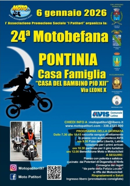 L'Epifania è sinonimo di festa, ma per l'Associazione di Promozione Sociale “I Patitori” della provincia di Latina, è soprattutto sinonimo di solidarietà su due ruote. Il 6 gennaio 2026 si rinnova infatti un appuntamento imperdibile per la comunità del centauro: la 24^ Motobefana dei Motopatitori. Un evento che, giunto ormai a oltre venti edizioni, ha saputo unire la passione per la moto a un nobile scopo benefico, riassunto nel motto dell’associazione: “fare del bene fa bene”.