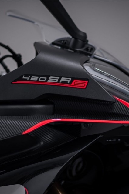 Presentata ufficialmente all'inizio del 2024 (dopo il grande interesse suscitato dal concept SR-C21 del 2021), la 450SR-S è la versione "pregiata" della 450SR standard. Si distingue immediatamente per l'adozione di un raffinato forcellone monobraccio e un'estetica ancora più aggressiva, caratterizzata da alette aerodinamiche frontali e uno scarico basso integrato.