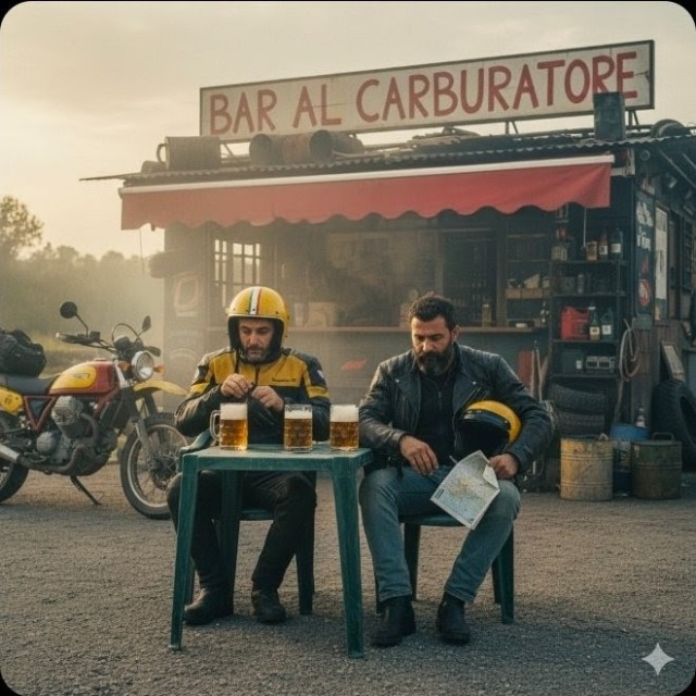 Il bar "Al Carburatore" era il solito porto di mare alla periferia di Roma. L’aria odorava di caffè bruciato, olio motore e sogni stantii. Seduti a un tavolino di plastica traballante, Sfreccia-Senza-Meta e Saetta Lumaca fissavano i loro boccali di birra.
