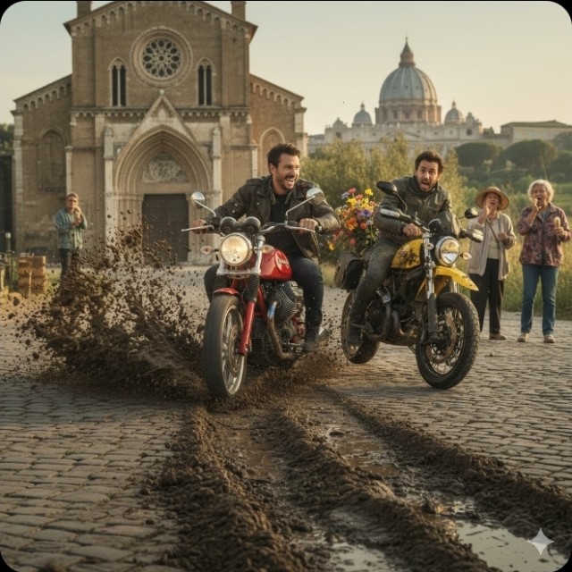 Usciti dal bar, le loro cavalcature splendevano al sole romano. La Ducati Scrambler 800 gialla di Saetta Lumaca sembrava un limone cinetico, mentre la Moto Guzzi V7 rossa di Sfreccia-Senza-Meta vibrava per l'impazienza.