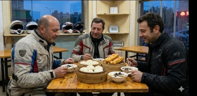 Il rito prevede i celebri Baozi di Tianjin, panini al vapore soffici e saporiti, accompagnati dagli Youtiao, bastoncini di pasta fritta dorata. Seduti a un tavolo di legno segnato dal tempo, Gianni, Marco e Luigi osservano il vapore salire dalle ciotole di zuppa di tofu. È un momento di silenzio quasi religioso. I loro caschi sono appoggiati su una panca, le giacche sono ancora incrostate della polvere raccolta nei deserti e sui passi montani. In quel piccolo bar, tra i profumi di soia e zenzero, si rendono conto che questo è l'ultimo "buongiorno" della spedizione. La complicità è totale: non servono molte parole, basta un cenno mentre si divide l'ultimo Baozi.