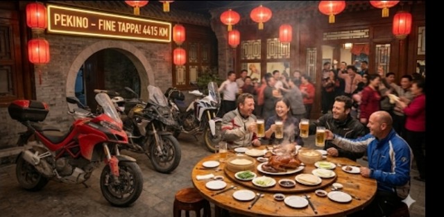 Le moto, ormai diventate estensioni dei loro corpi, vengono parcheggiate in posizione d'onore. La cena è un banchetto degno di un imperatore: l'immancabile Anatra Laccata, servita con pancakes sottili e salsa hoisin, domina il tavolo rotante. I boccali di birra Yanjing si scontrano in un brindisi fragoroso che attira l'attenzione degli altri commensali. C'è Mei che sorride orgogliosa, ci sono le risate di chi sa di avercela fatta. La stanchezza sparisce, sommersa dai festeggiamenti e dalla consapevolezza di aver portato a termine il "sogno Orient Express".