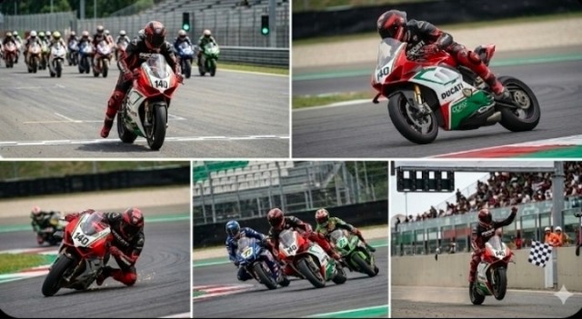 Oggi, però, non c'è più spazio per le chiavi inglesi. Siamo in pista. Il collage di immagini della sua giornata mostra l'evoluzione di un'emozione: dalla tensione della partenza alla gioia sfrenata del traguardo. Mauro osserva la sua Ducati e sente il battito del cuore sincronizzarsi con il minimo irregolare del motore. Sa che oggi non sta solo provando una moto; sta mettendo alla prova se stesso, il suo lavoro e la sua vita. È il momento di smettere di essere un meccanico e diventare, finalmente, un pilota.